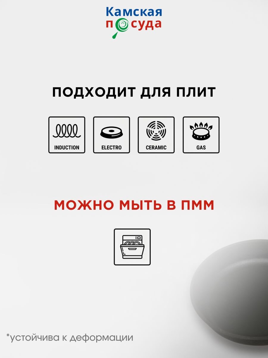 Да, чугунная сковорода Камская посуда с4060 совместима с индукционными, газовыми, электрическими и стеклокерамическими плитами благодаря массивному дну и материалу.