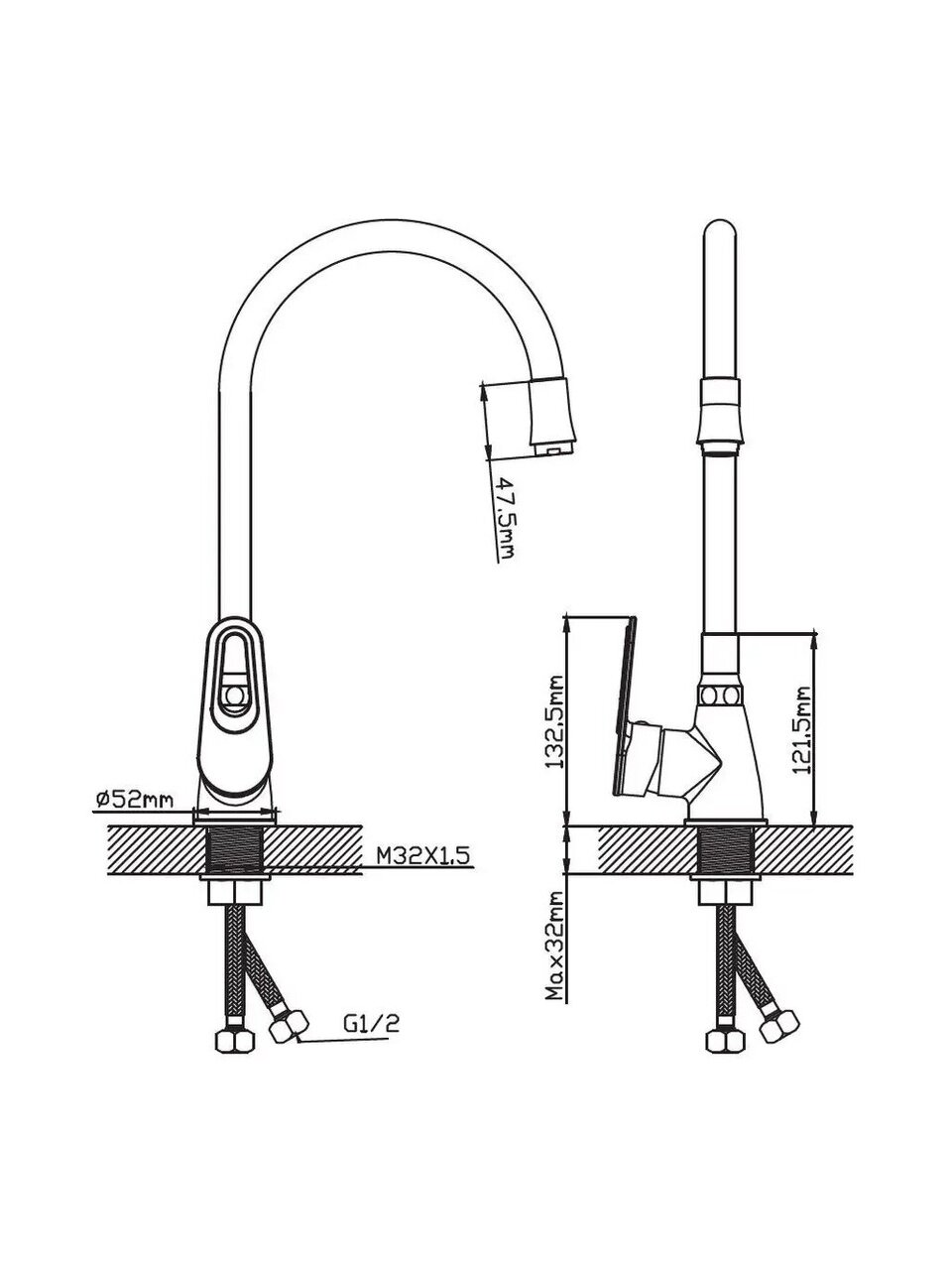 Для установки требуется одно отверстие диаметром 32 мм. Монтаж осуществляется горизонтально, крепление — на гайку.