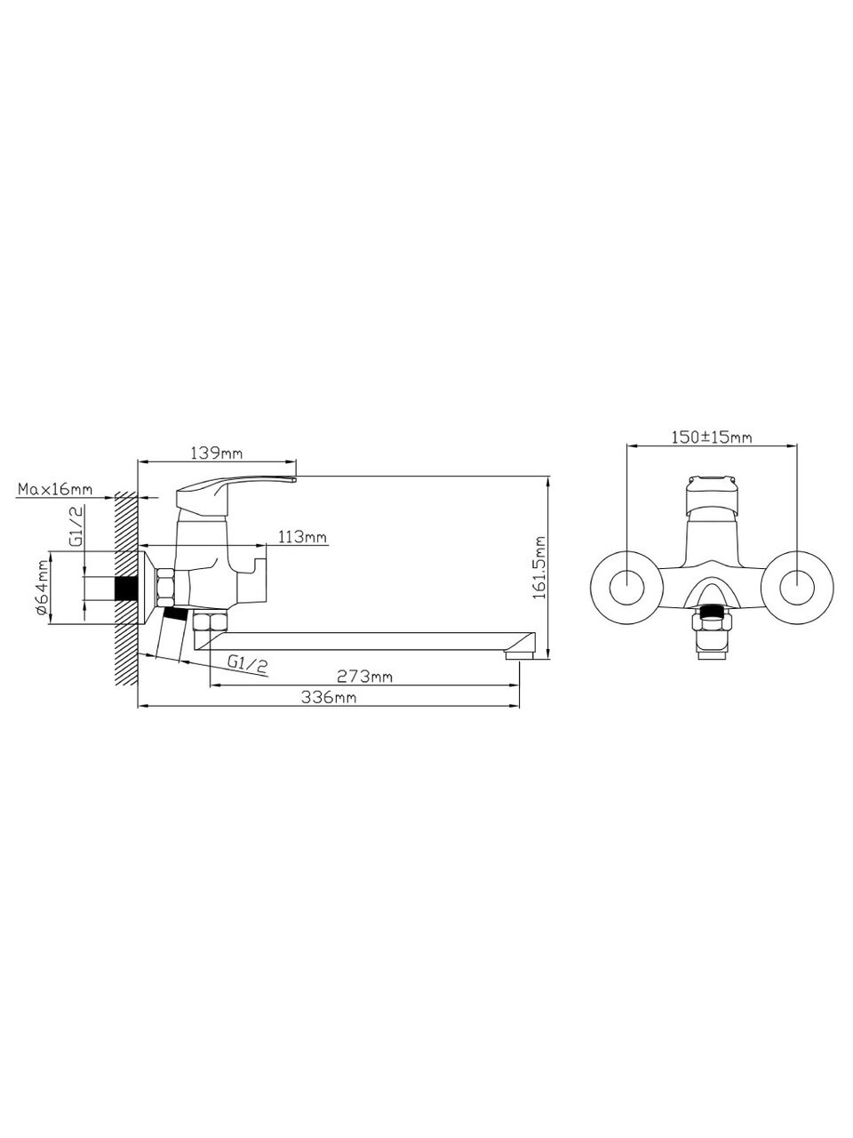 Смеситель устанавливается вертикально на стену, имеет межосевое расстояние 150 мм, длина излива — 30 см, диаметр монтажных отверстий — 12,7 мм, крепление — гайка.