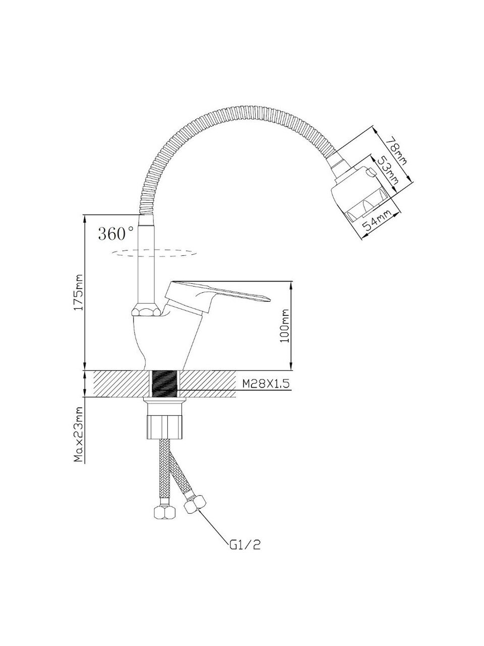 Для монтажа требуется одно отверстие диаметром 35 мм, стандарт подключения шланга — 1/2". В комплекте есть гибкая подводка, установка горизонтальная.