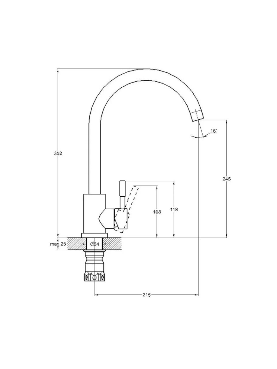 Высота излива — 24,5 см, длина излива — 21,5 см, стандарт подводки — 1/2", диаметр монтажного отверстия — 34 мм, в комплекте гибкая подводка по 40 см.