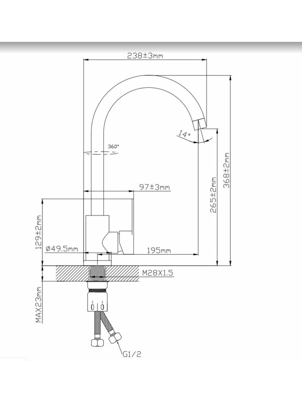 Смеситель устанавливается горизонтально в одно отверстие, стандарт подводки — 1/2", в комплекте — две гибкие подводки по 40 см. Высокий поворотный излив среднего размера идеально подходит для большинства кухонных раковин.