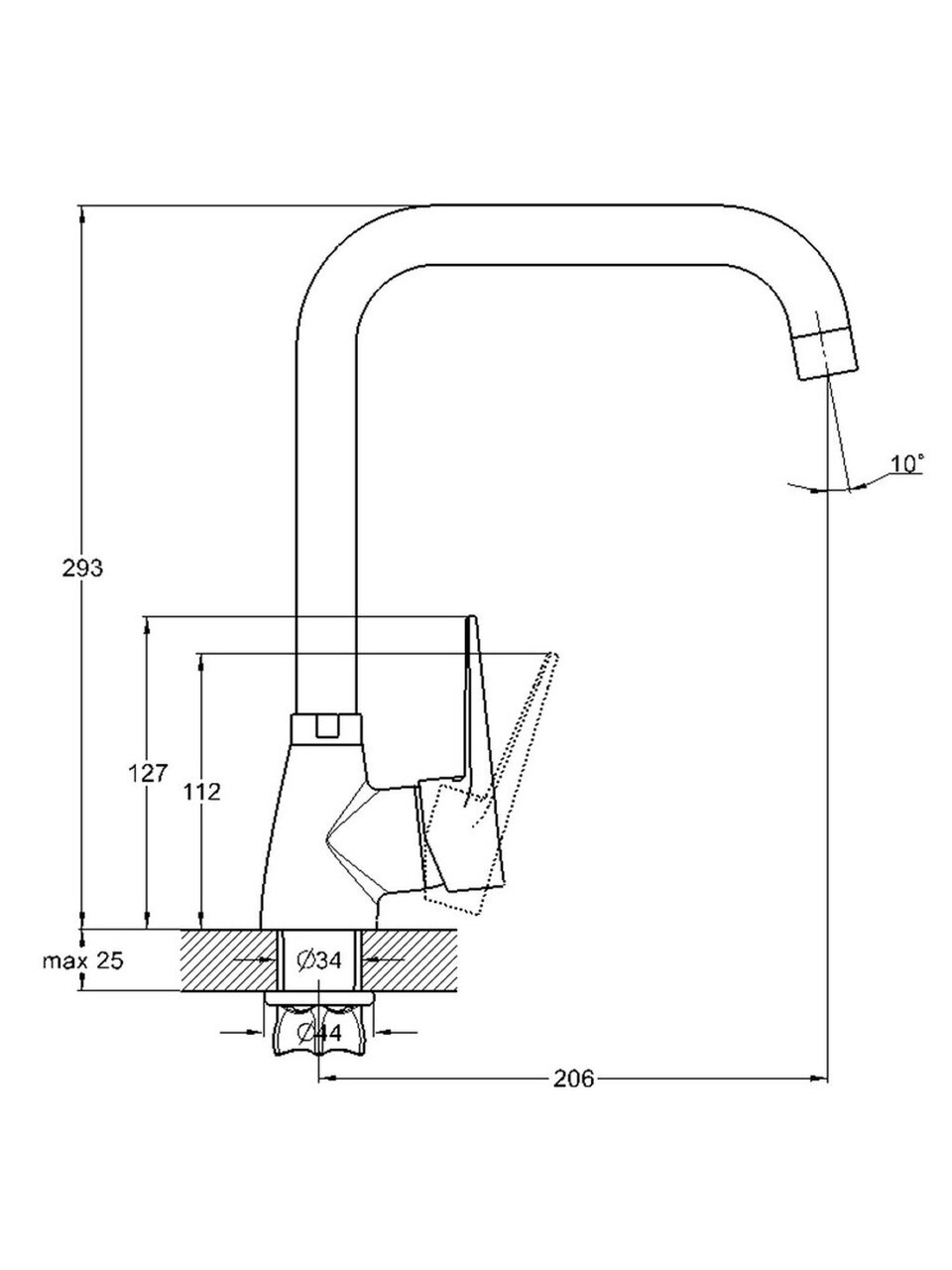 - Высокий поворотный излив 20,6 см — удобно мыть посуду, наполнять большие кастрюли и вазы