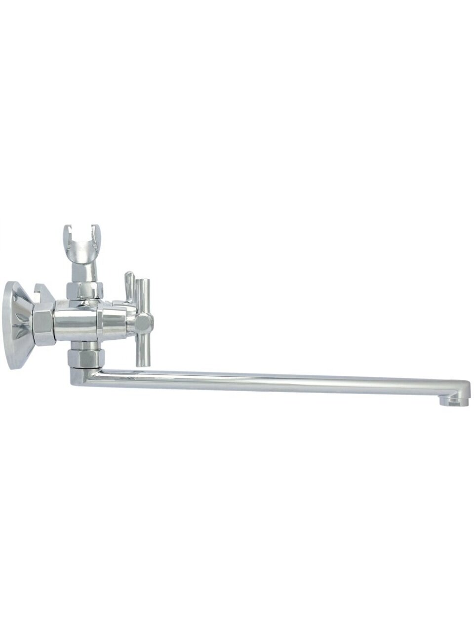 - Двухвентильное управление и поворотный длинный излив — удобно для наполнения ванны и душа