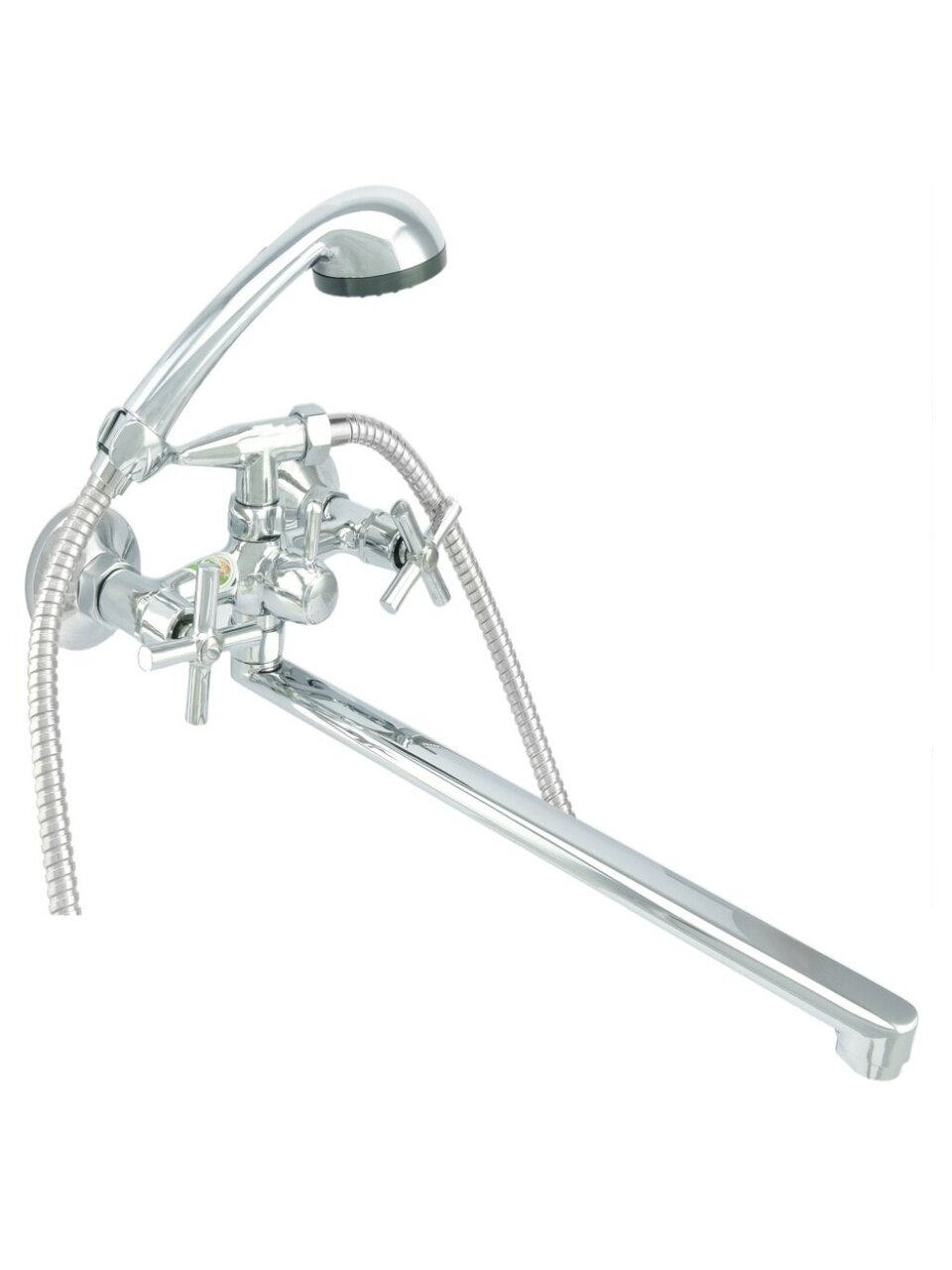 - Корпус из прочного силумина, хромированное покрытие, межосевое расстояние 150 мм — устойчив к коррозии и подходит для стандартных коммуникаций
