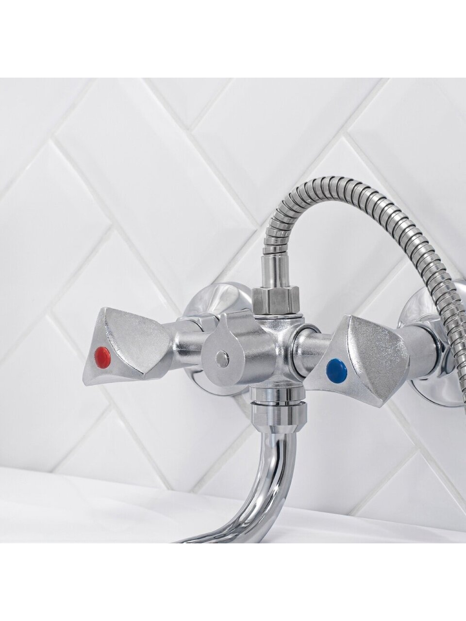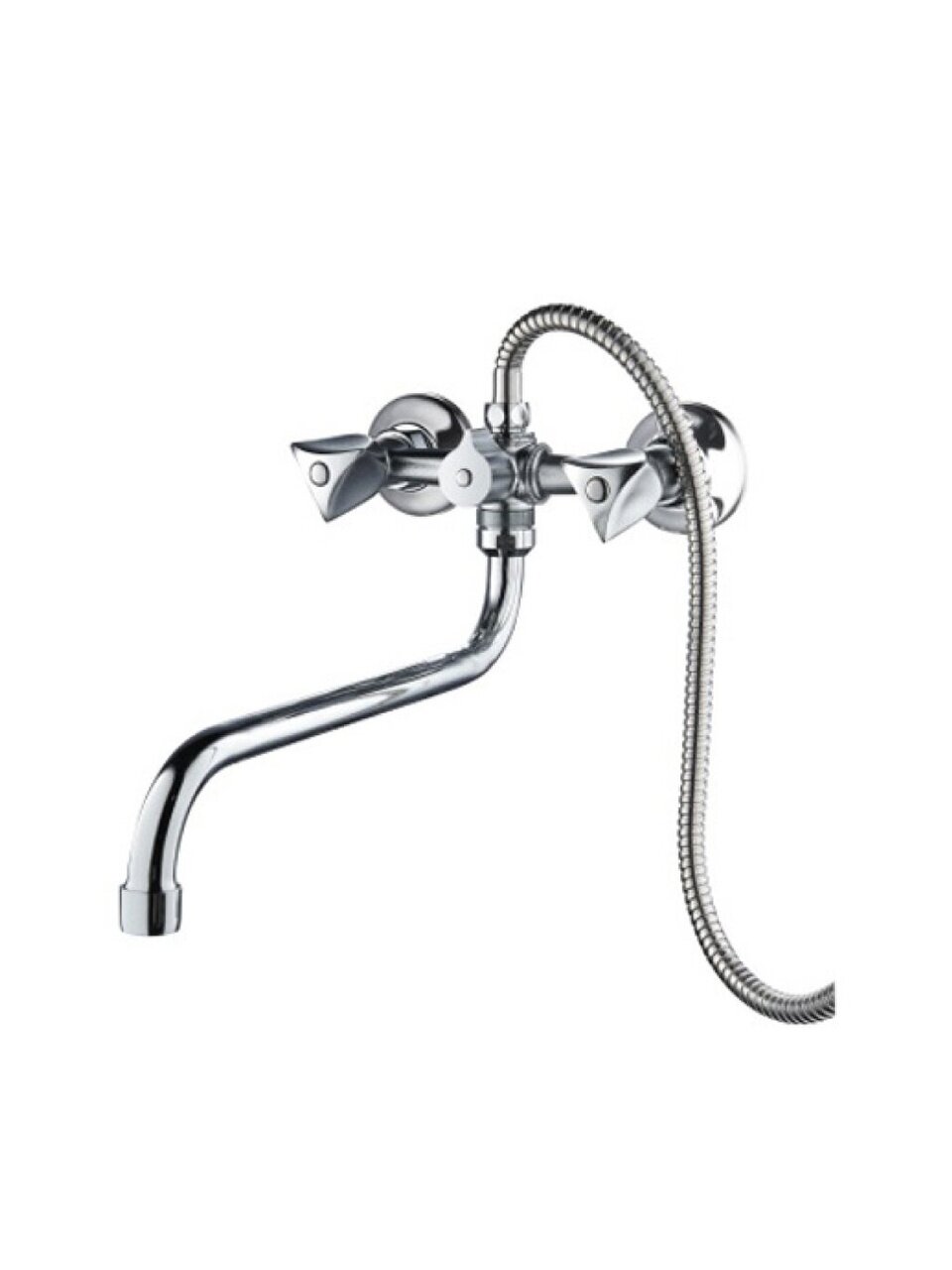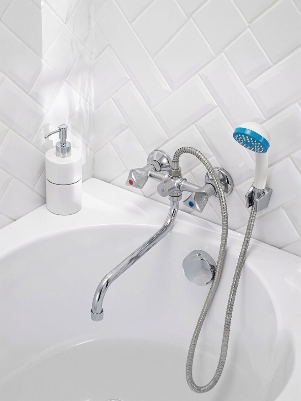 Обратите внимание на длину излива (29,5 см), материал корпуса (цинковый сплав), тип управления (двухвентильный с керамической кран-буксой) и комплектацию (лейка, шланг, держатель). Эта модель подходит для стандартных ванн и душа, легко монтируется на стену.