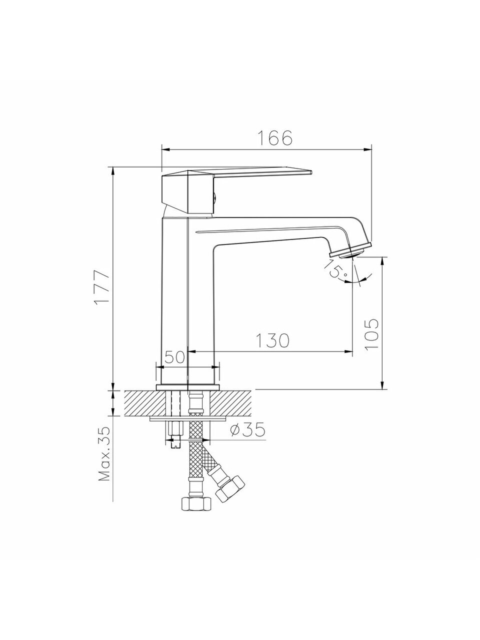 Для установки требуется одно отверстие диаметром 35 мм. Крепление — шпилька, стандарт подводки шланга 1/2".