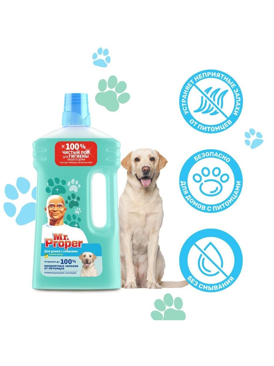 Владельцам собак проще поддерживать чистоту в доме, когда под рукой есть специальное средство. Жидкий Mr. Proper легко удалит следы от лап, засохшие остатки корма и другие загрязнения.