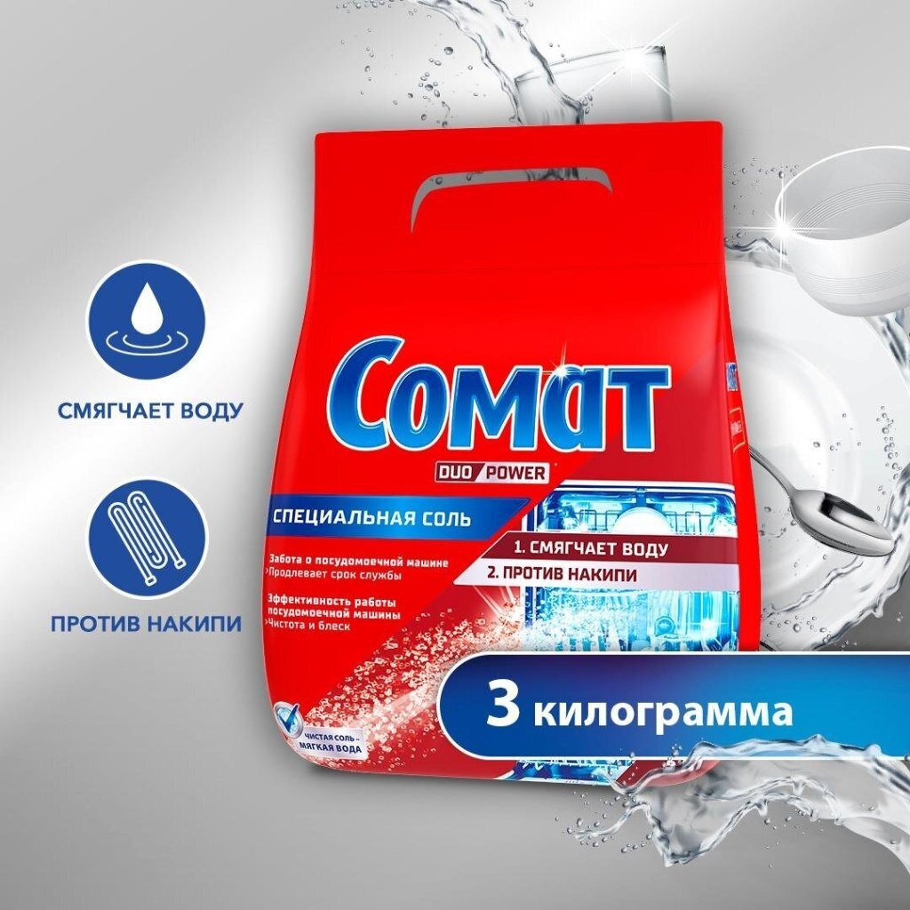 Специальная соль для посудомоечной машины Сомат смягчает воду, предотвращая образование известкового налета на разбрызгивателях и сливной трубе, тем самым соль для посудомойки продлевает срок службы Вашей посудомоечной машины. Откройте для себя 5 активных действий специальной соли для посудомоечной машины Сомат: