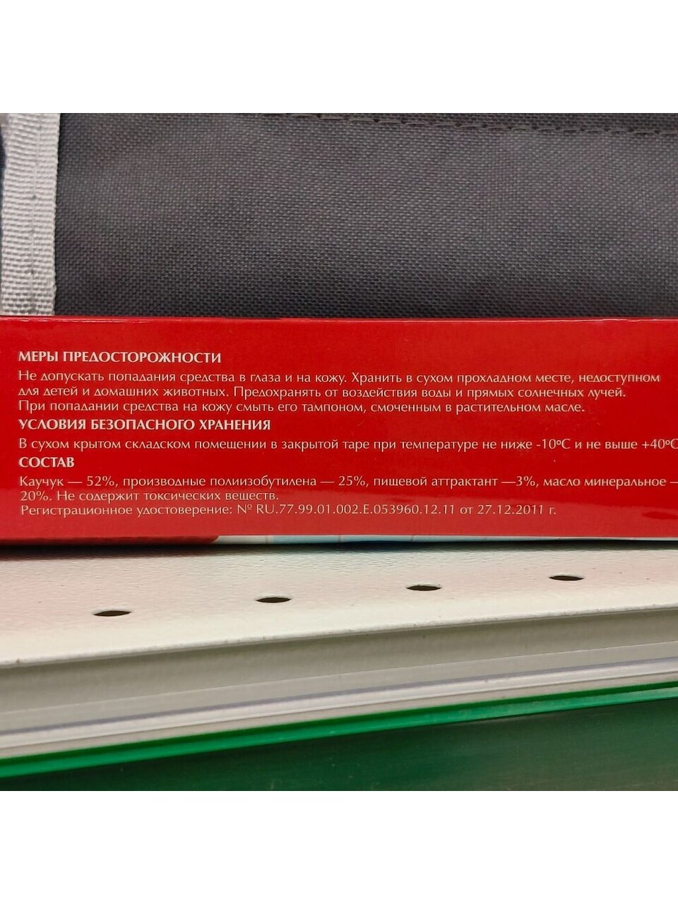 Состав: каучук (52 %), пищевой аттрактант (3 %), масло минеральное (20 %).