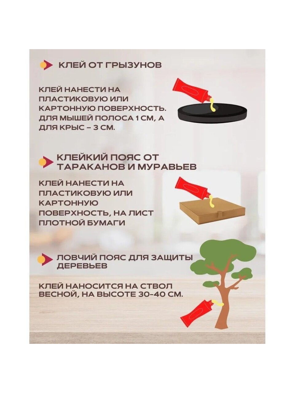 Клей Mr.Mouse является универсальным эффективным средством для механического отлова мелких грызунов (мышей, крыс, полёвок и т.д.), бытовых насекомых (тараканов, муравьёв и т.д.), садовых вредителей (гусениц, улиток и т.д.).