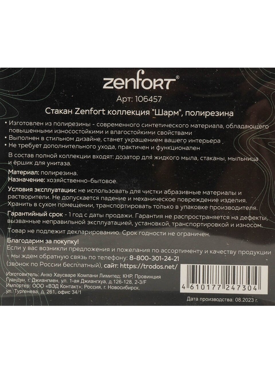 Покупка стакана Zenfort коллекции Шарм – выгодное вложение в комфорт и порядок дома. Такой аксессуар поможет создать аккуратную и эстетичную обстановку, избавит от беспорядка на полке или раковине, сэкономит время на уборку и обеспечит удобство ежедневного использования. В интерьере дома или дачи стакан Zenfort станет незаменимым элементом, который сочетает практичность, надежность и стиль. Добавьте изысканности и уюта в пространство – аксессуар Zenfort коллекции Шарм станет отличным выбором для ценителей качественных товаров для дома.