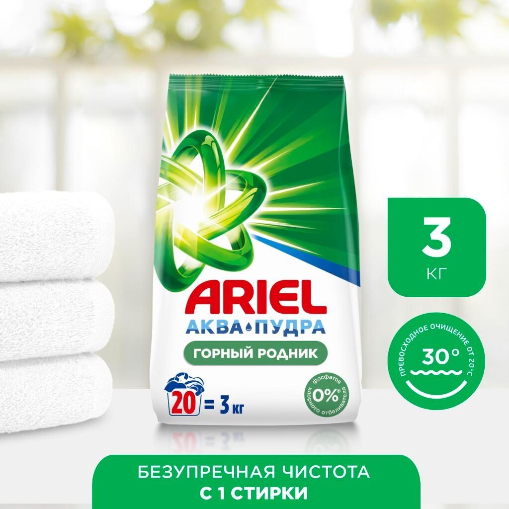 Ariel Аквапудра Горный родник позволяет поддерживать одежду всей семьи в отличном состоянии и идеальной чистоте. Теперь ваши любимые вещи прослужат вам еще дольше.