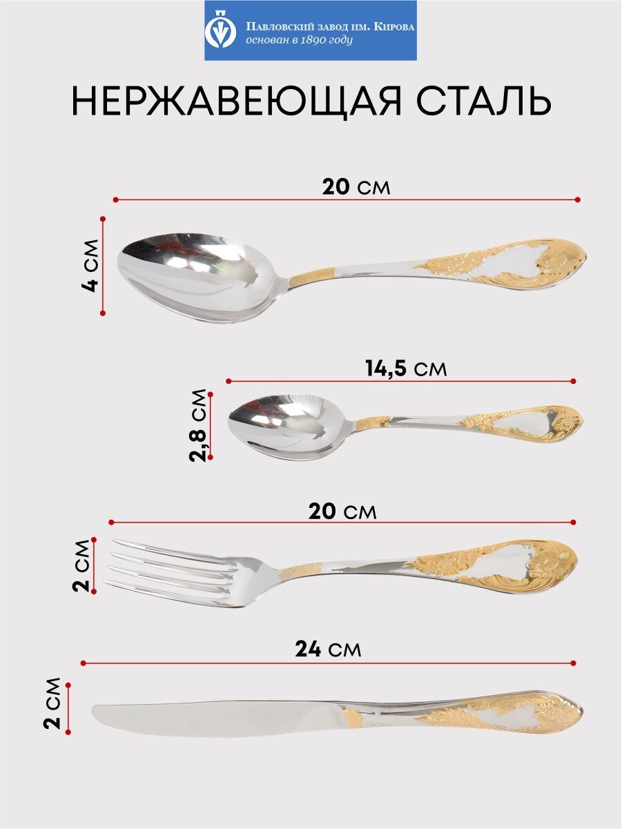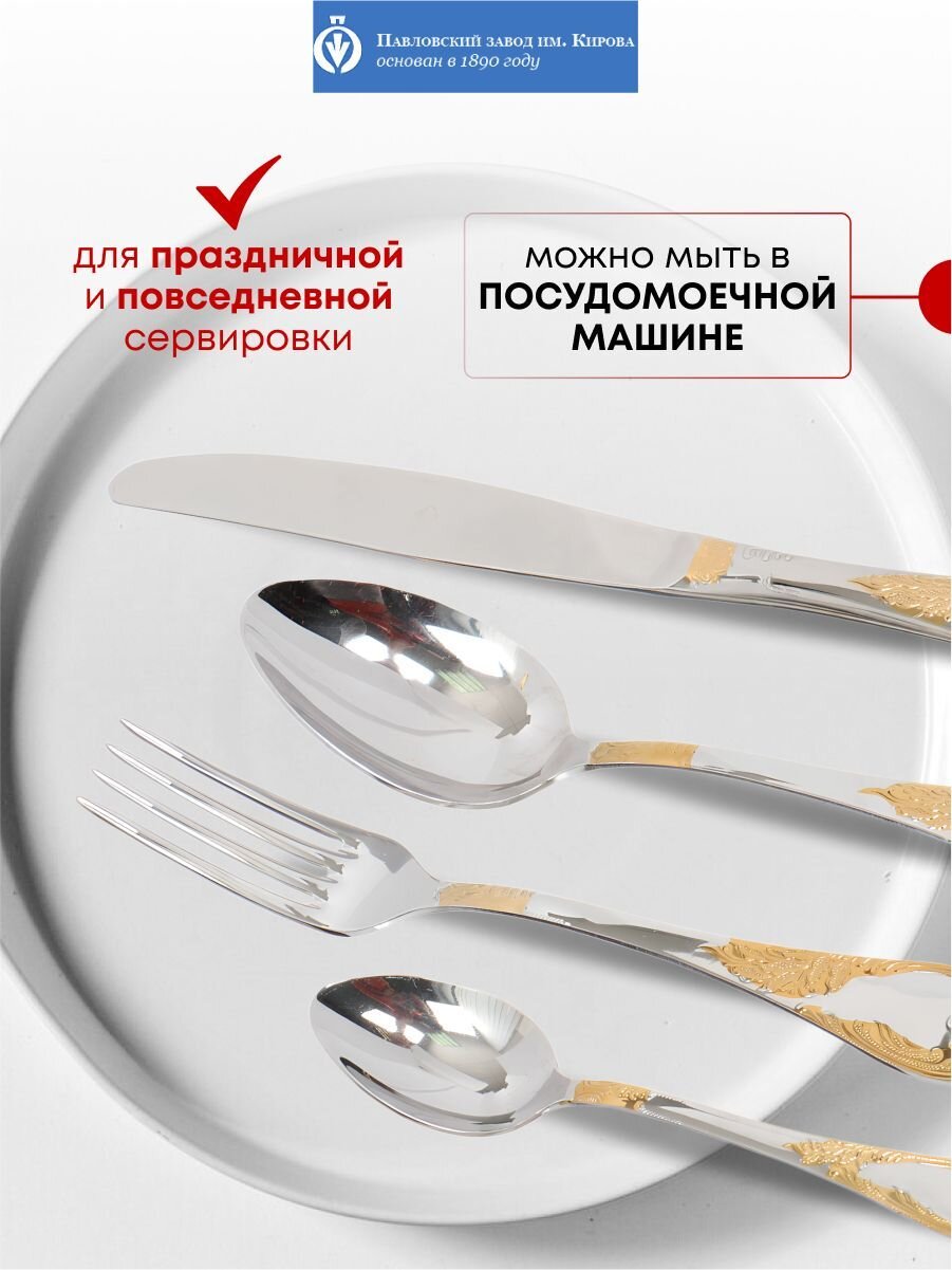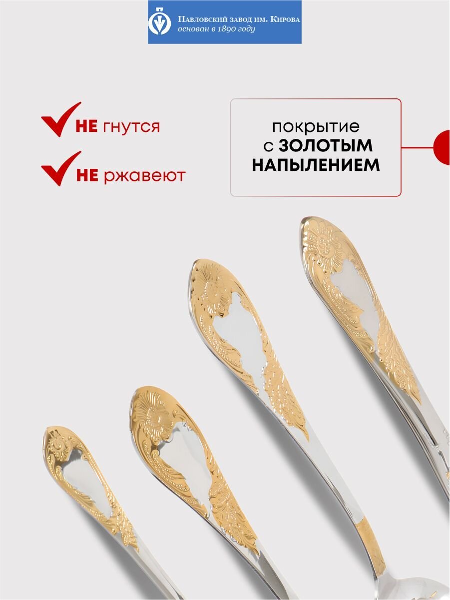 Этот набор столовых приборов из нержавеющей стали с золотым напылением — выбор тех, кто ищет не просто посуду, а элемент декора и символ статуса. Классический стиль, фигурные металлические ручки и художественная роспись делают его отличным решением для праздничной сервировки и повседневного использования. Многие спрашивают: «Какой набор столовых приборов выбрать для подарка?» — Императорский М-12 от Павловского завода им. Кирова отлично подходит благодаря своему презентабельному виду и универсальности.