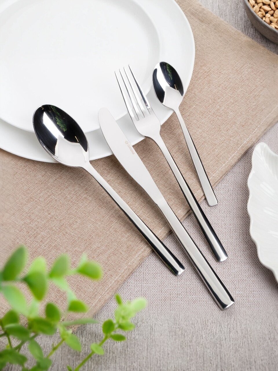 Набор столовых приборов Daniks Verona — это продуманное сочетание функциональности и современного стиля. В комплекте 24 предмета из нержавеющей стали: ложки, вилки, ножи и чайные ложки для 6 человек. Серебристый цвет гармонирует с любой сервировкой, а металлические ручки обеспечивают удобство в использовании. Для тех, кто ищет, какой набор столовых приборов лучше выбрать для дома или подарка, этот вариант оптимален по соотношению цены и качества.