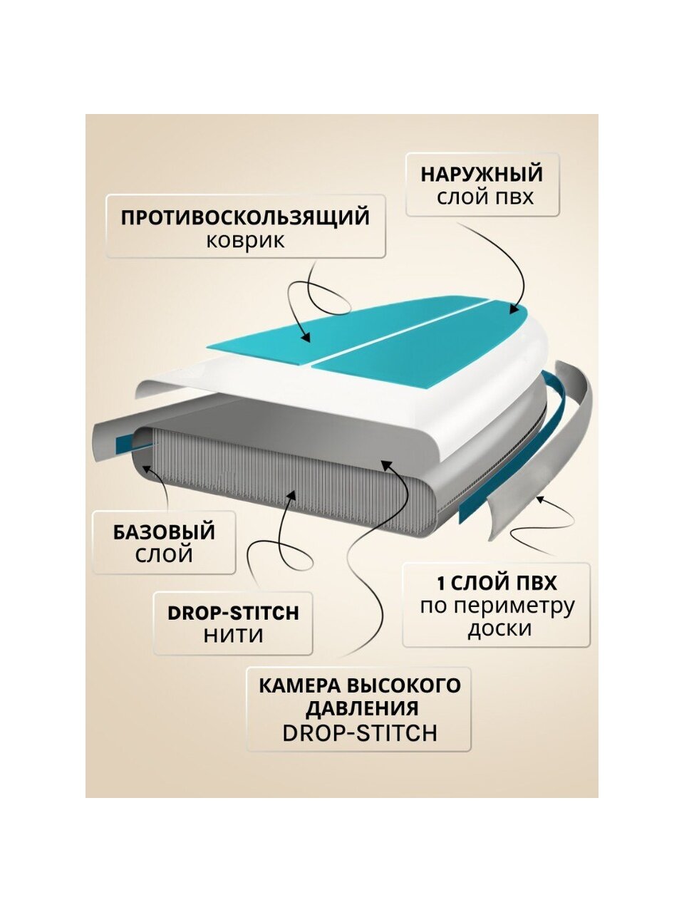 Максимальная нагрузка в 200 кг позволяет комфортно кататься как одному, так и с дополнительным грузом. Один плавник с крепежом обеспечивает отличную маневренность и стабильность на воде, а плоский тип корпуса способствует лёгкому скольжению и устойчивости.