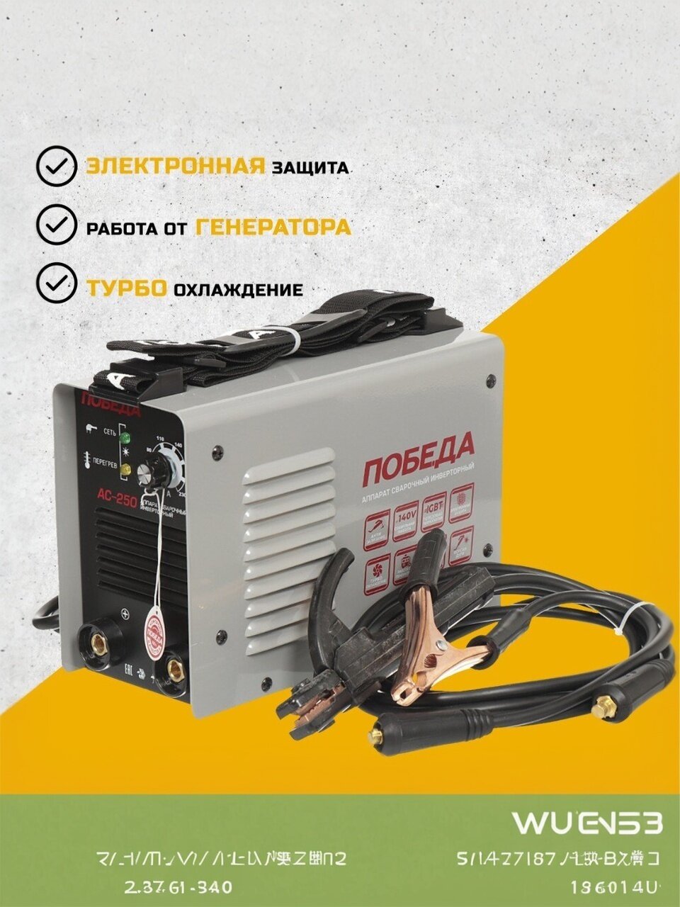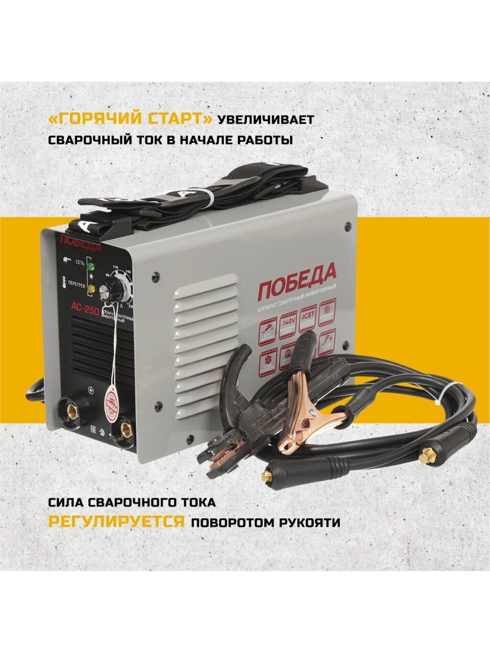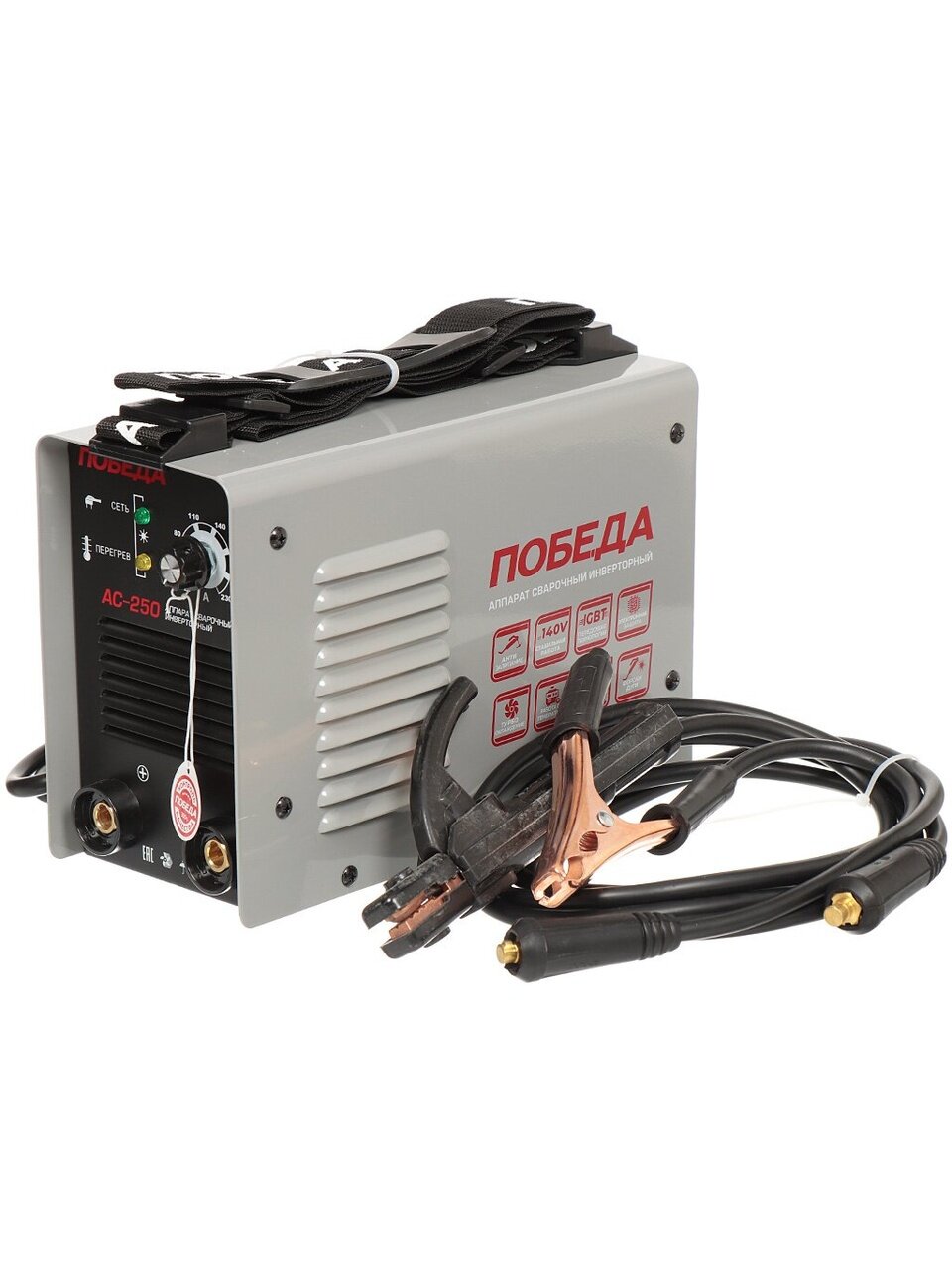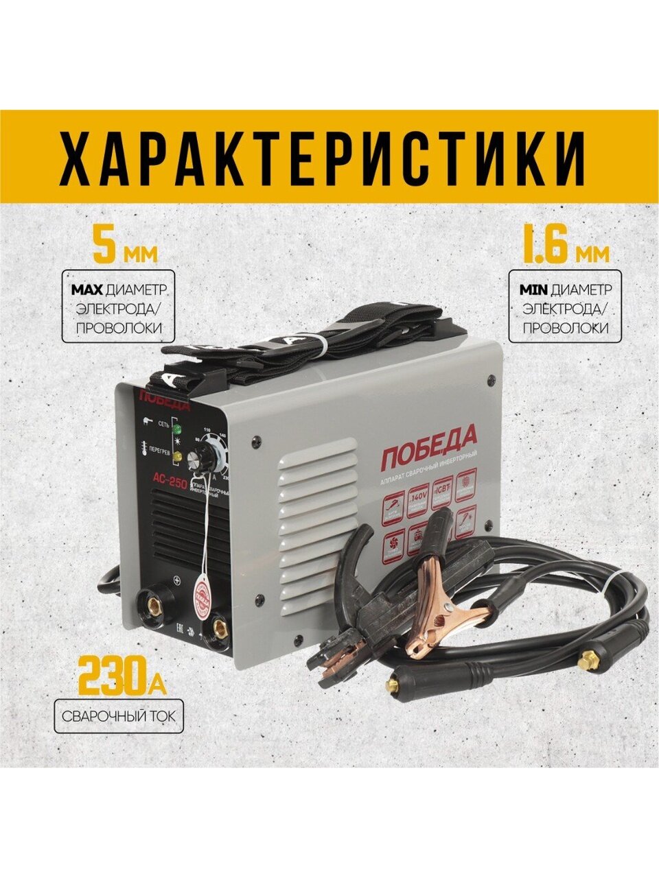 ПОБЕДА АС 250 – сварочный аппарат с максимальным сварочным током 230 А. Пригодится для частной мастерской и дачного строительства. Обеспечивает прочное соединение различных сталей, чёрных и цветных металлов. Макс. диаметр электрода 5 мм. Максимальная мощность 5500 Вт.