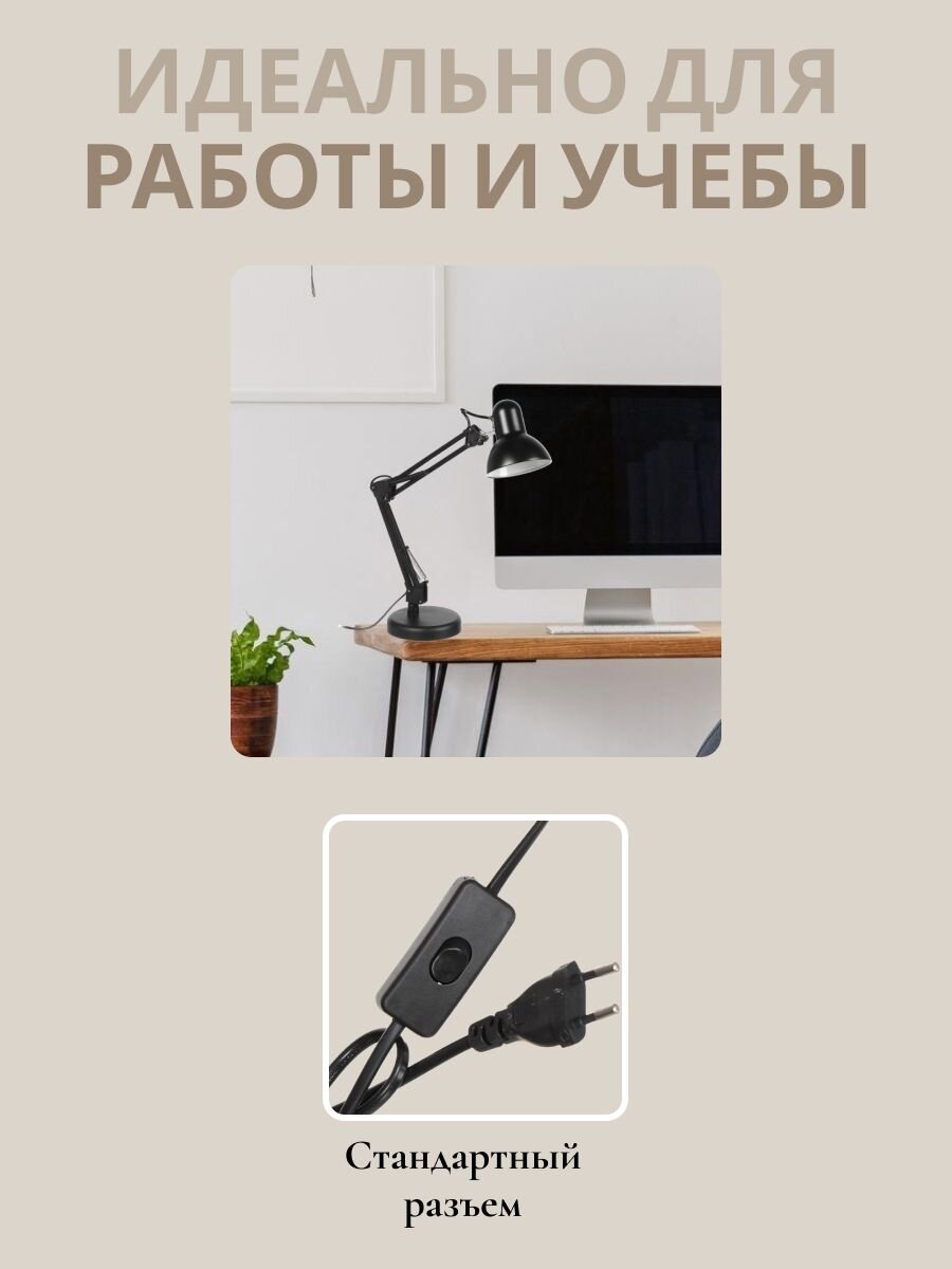 Светильник оснащен цоколем E27, что позволяет использовать разнообразные лампы, обеспечивая удобство и гибкость в выборе освещения. Питание от сети гарантирует стабильную работу, а управление осуществляется с помощью тумблера на шнуре, что добавляет удобства в использовании. Конструкция светильника предусматривает регулировку высоты, что позволяет адаптировать его под индивидуальные нужды и предпочтения.