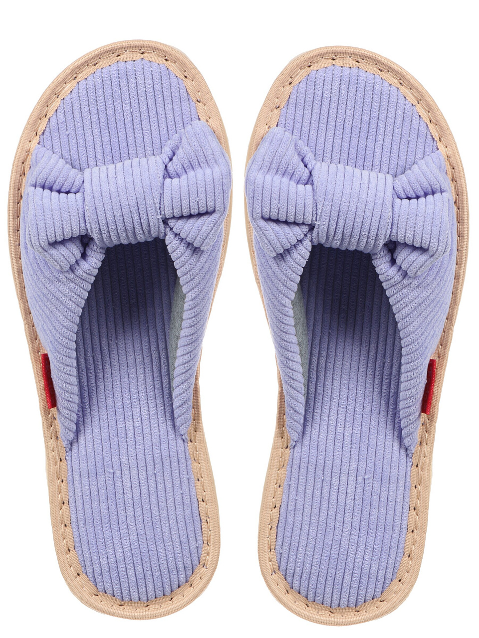 - Яркий фиолетовый дизайн и открытый фасон — свежесть ног, трендовый акцент в домашнем образе