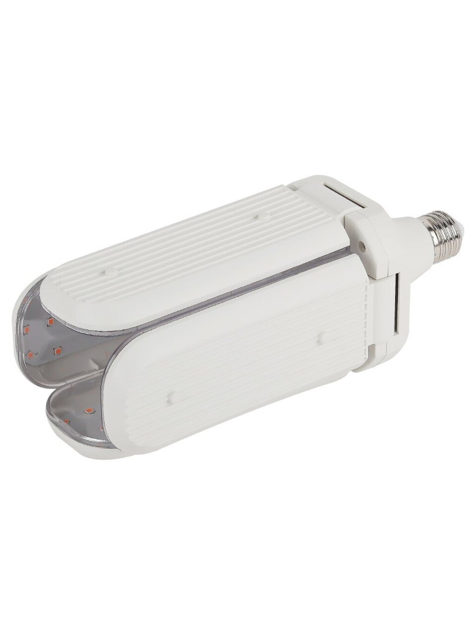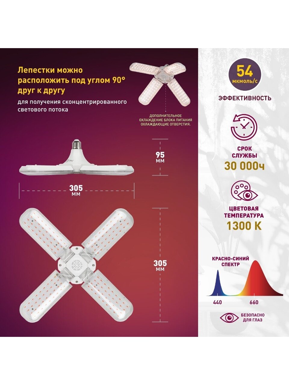 Фитолампа Е27 красно-синего спектра мощностью 36 Вт способна осветить несколько квадратных метров рассады с высокой эффективностью. Рекомендованная высота от лампы до листьев от 15 до 75 см. Регулировка поворота лепестков лампы на 180 градусов.