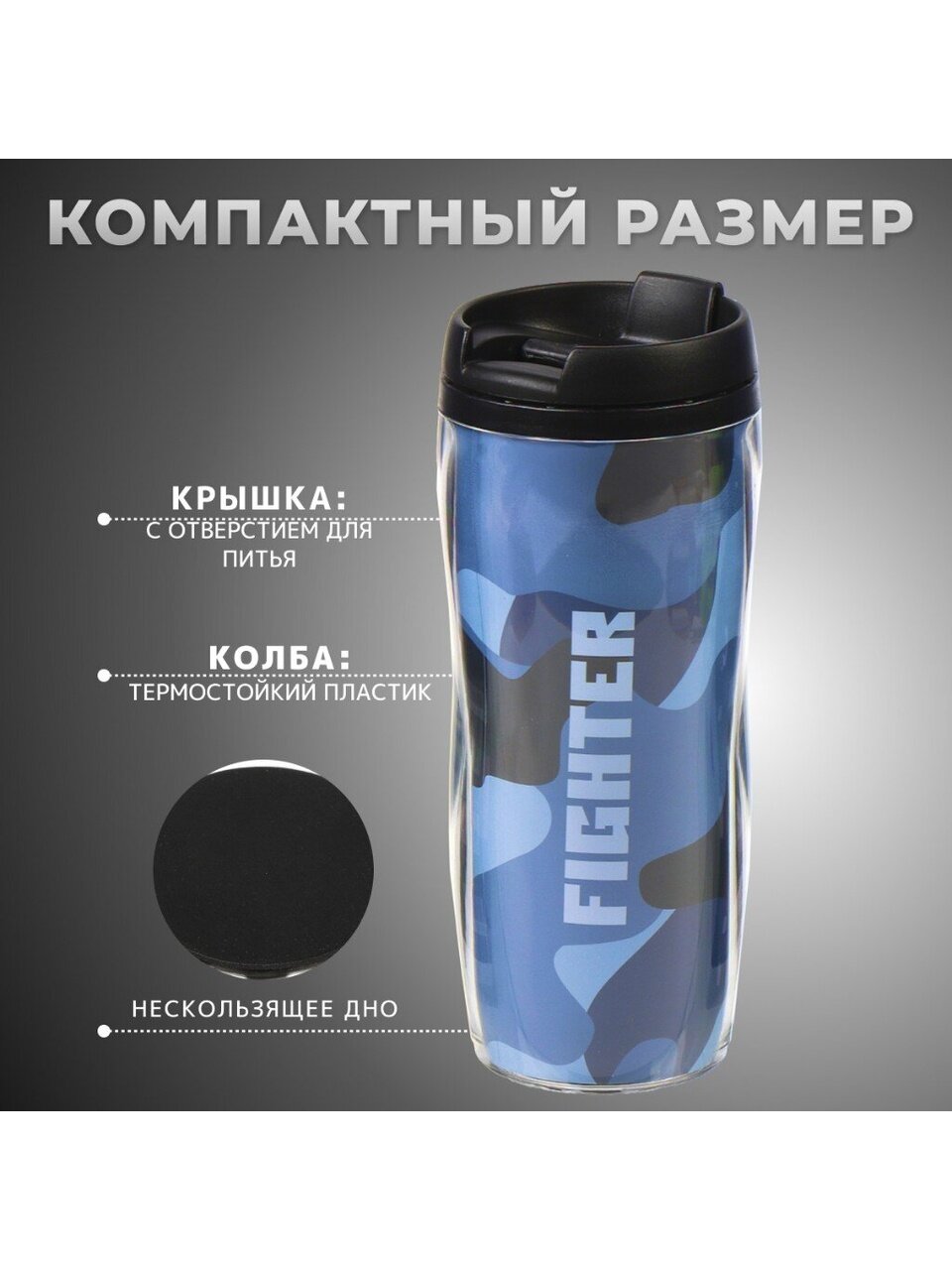 - Лёгкая и компактная — пластиковая термокружка Daniks весит меньше аналогов, не занимает место в рюкзаке или авто.