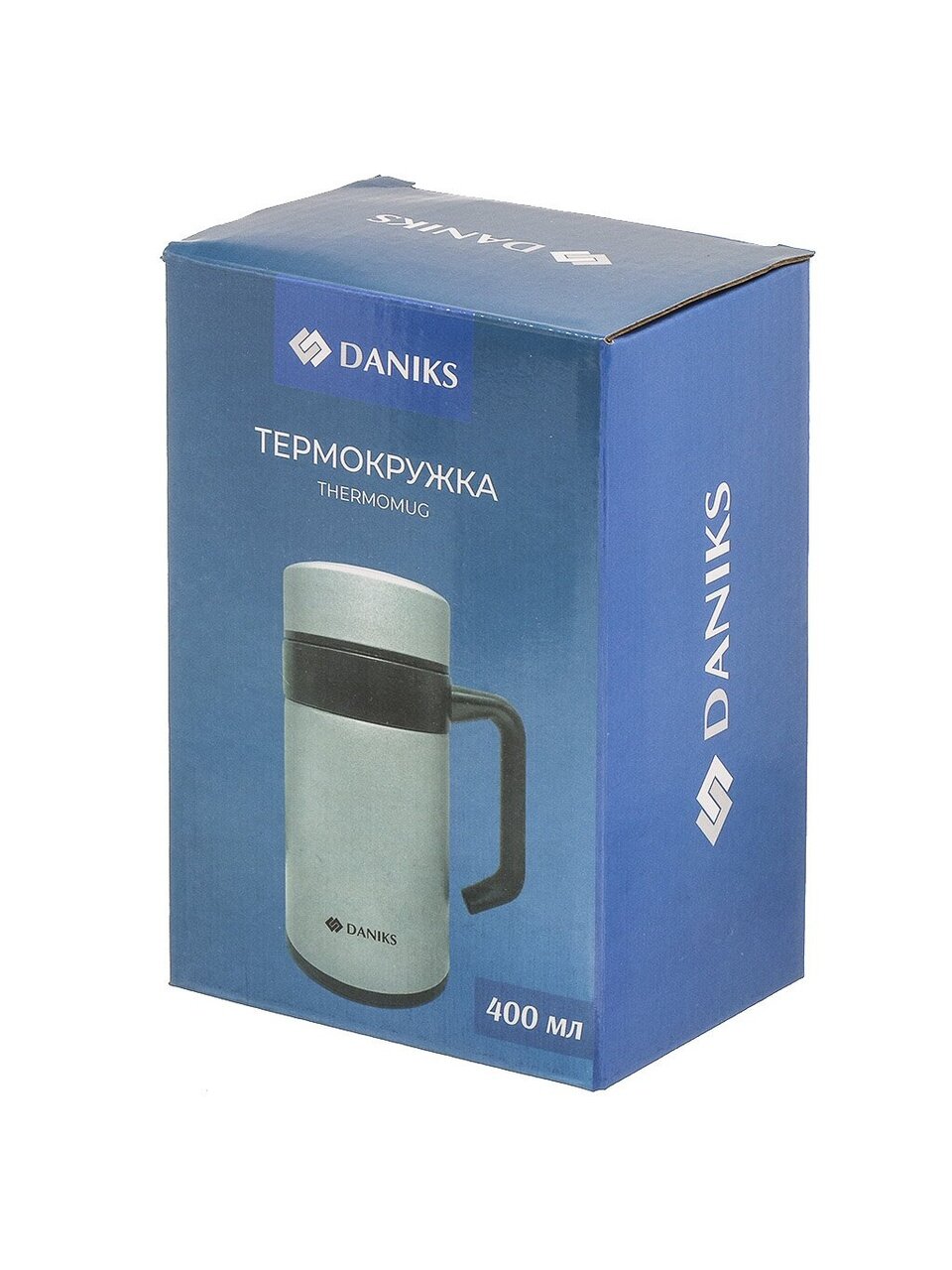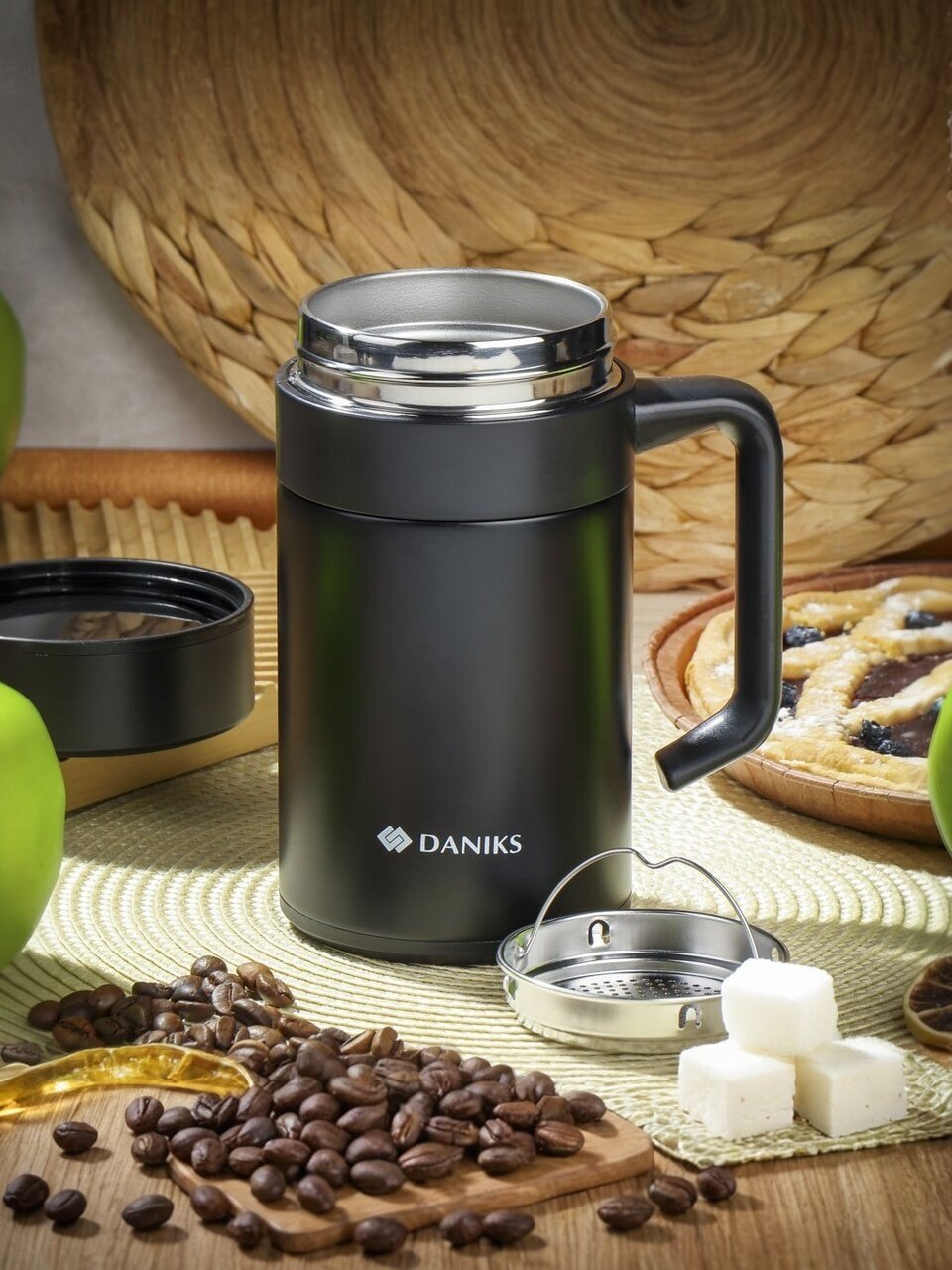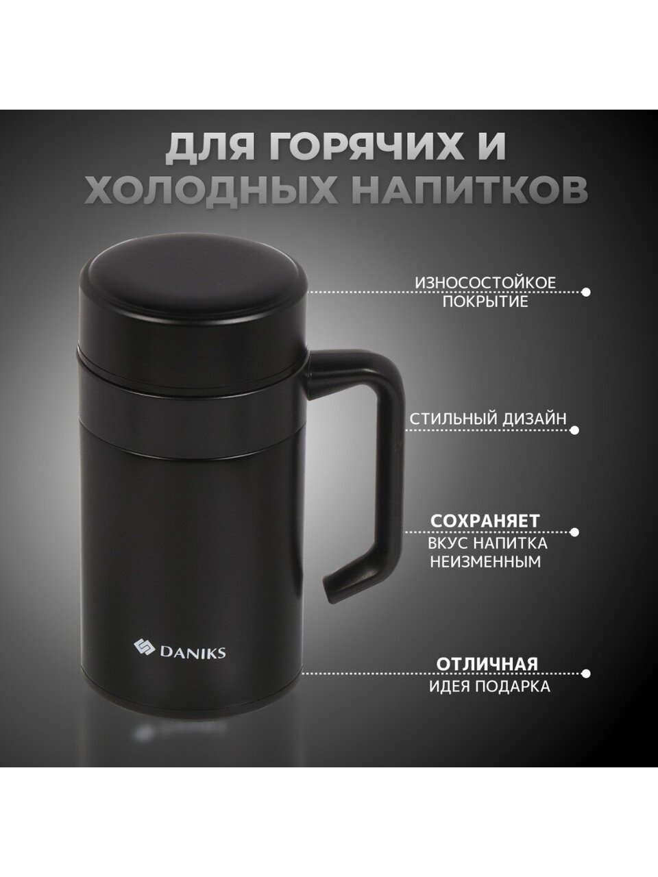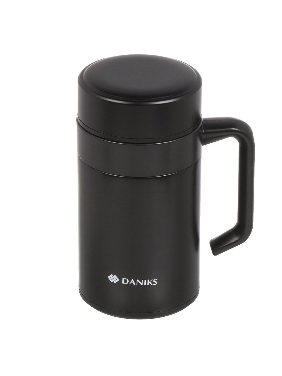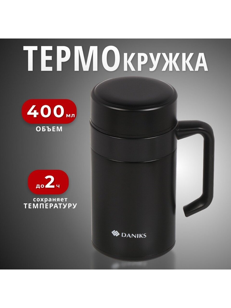 Термокружка Daniks 0.4 л: держит тепло 2 часа, нержавеющая сталь, черная ручка — для дома, офиса и поездок. Недорогой выбор для горячих и холодных напитков.