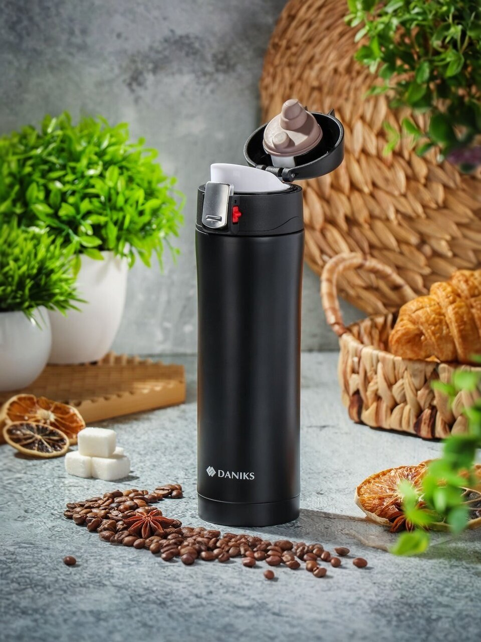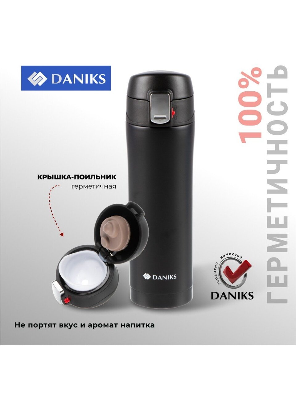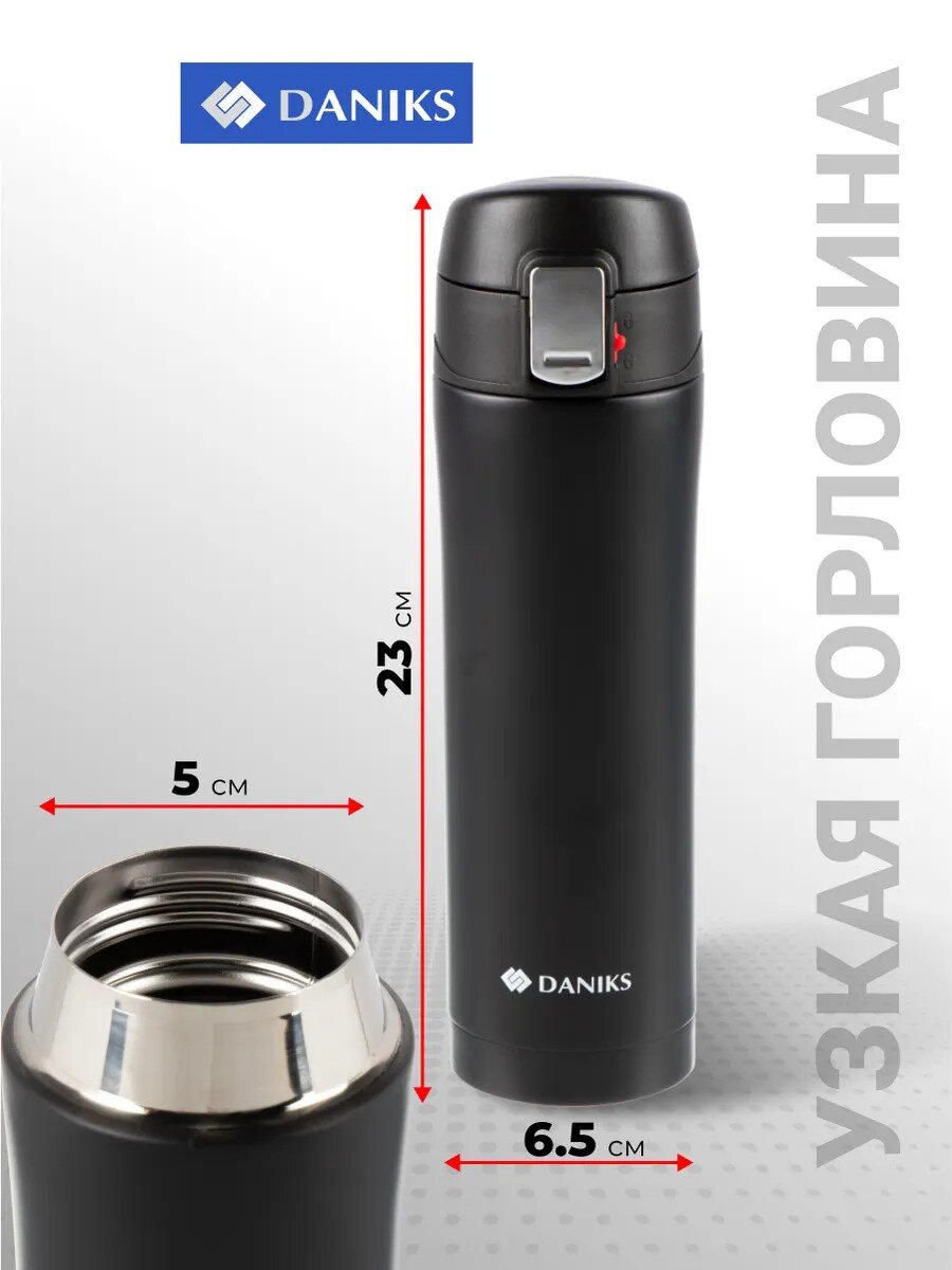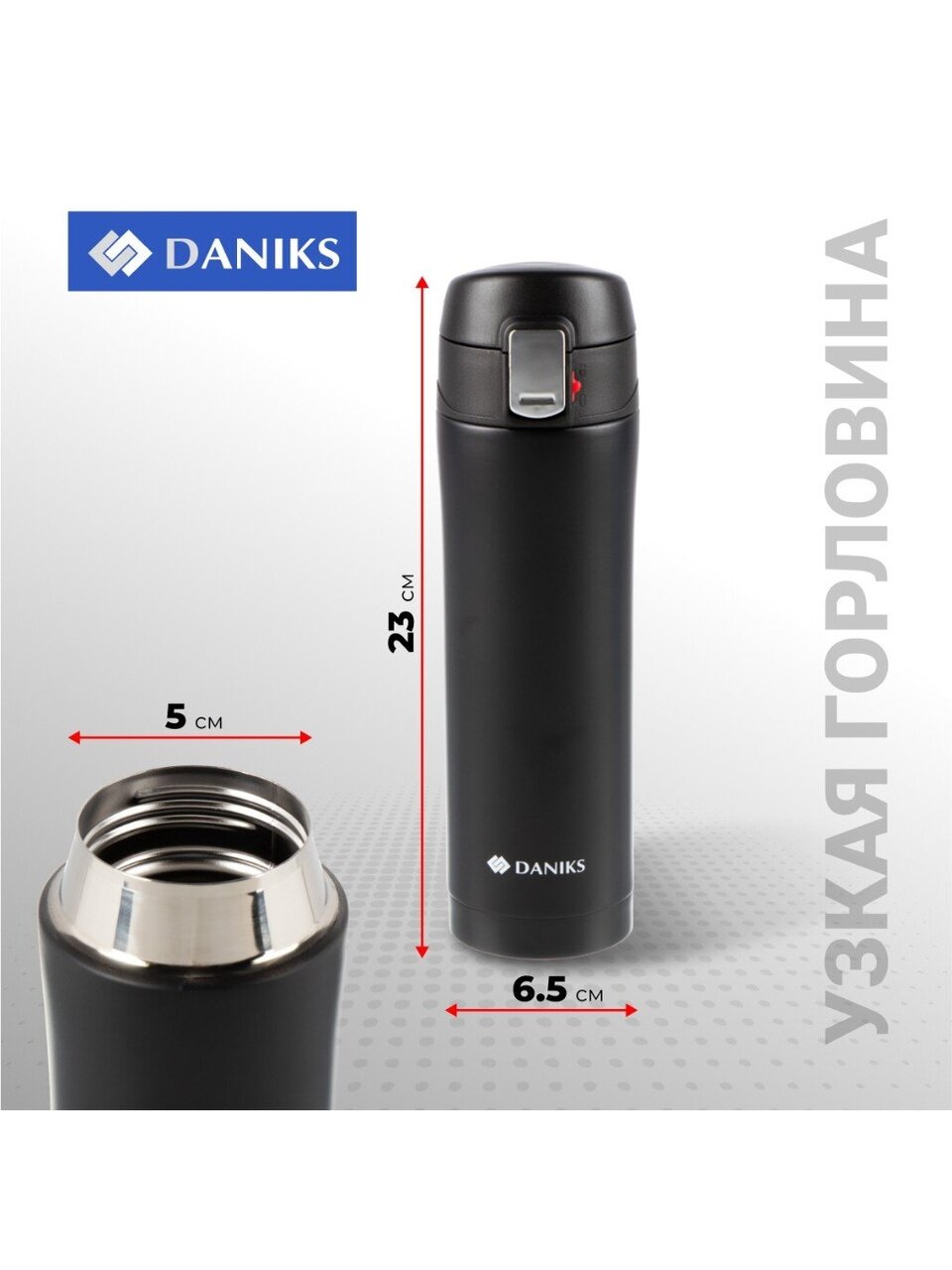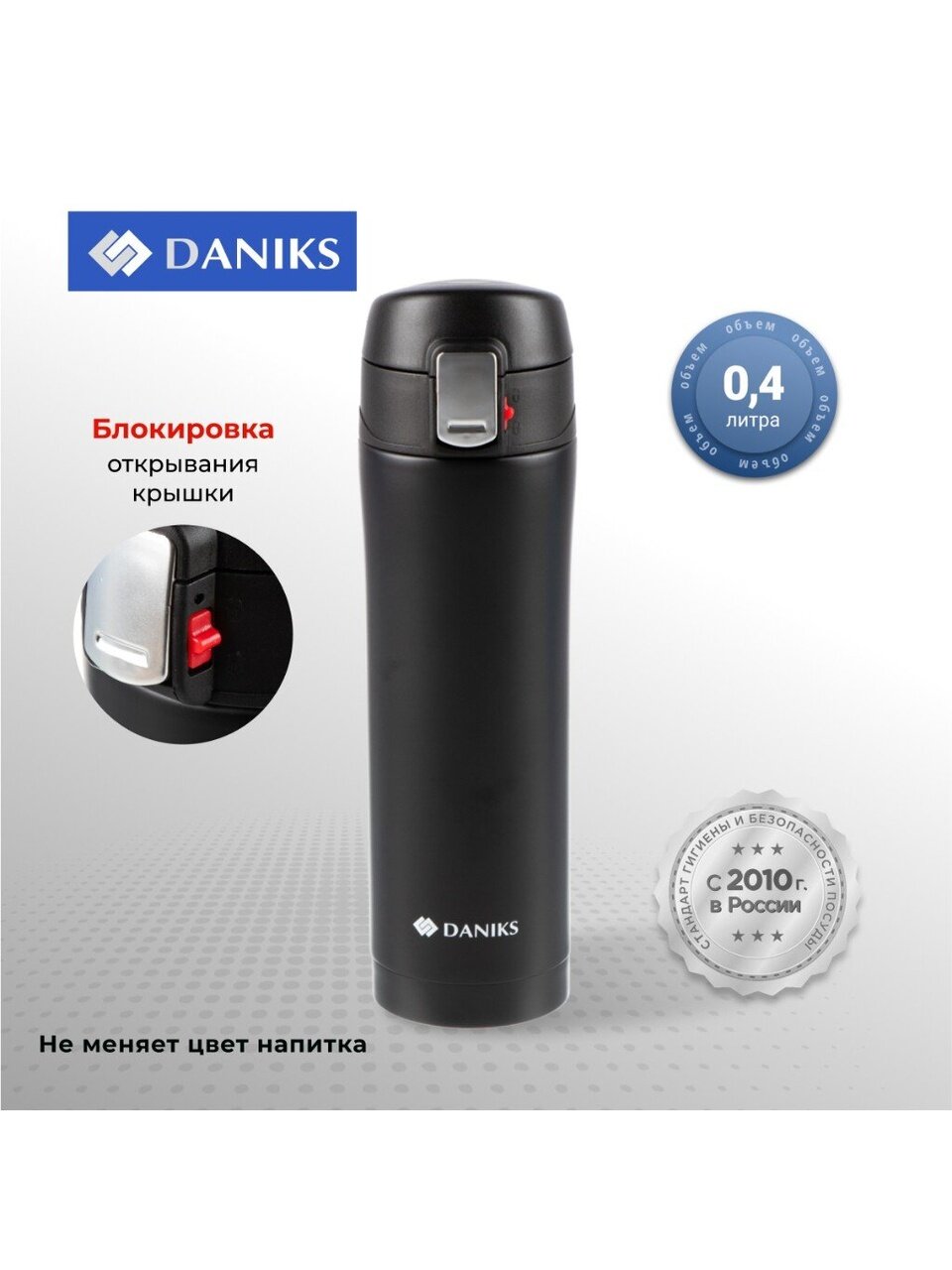 Daniks 0.4 л оптимален для города, спорта, работы, поездок на дачу, походов и автомобиля. Компактный размер удобно брать с собой, а стильный дизайн подойдет даже для подарка.