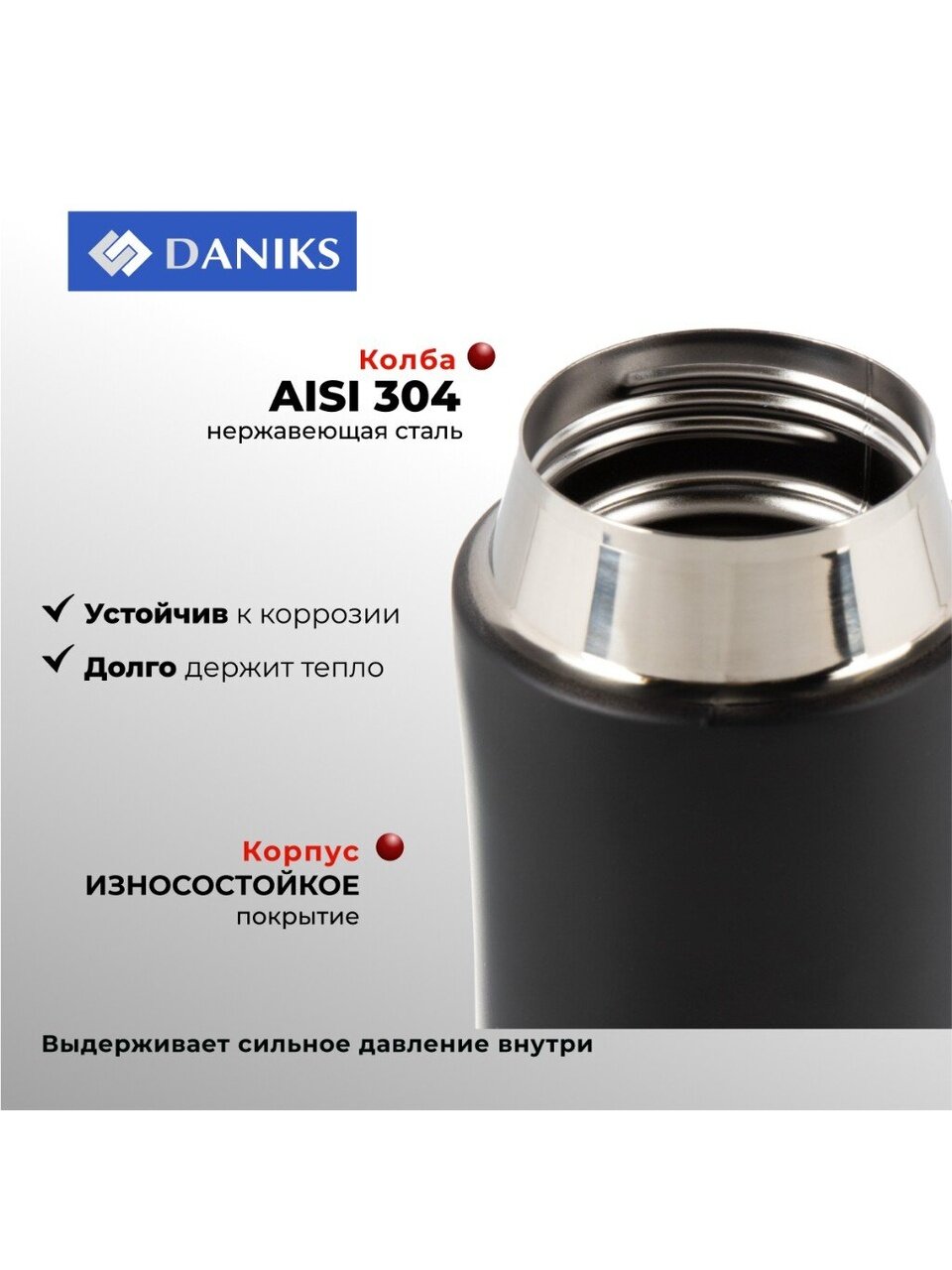 Термос Daniks 0.4 л с узкой горловиной: сохраняет температуру до 24 часов, компактный размер, стильный черный дизайн — идеален для города и путешествий.