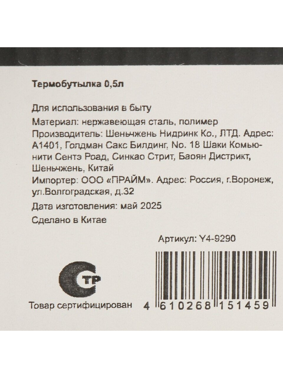 Термобутылка из нержавеющей стали 0.5 л Y4-9290: сохраняет температуру до 8 часов, компактна для города и спорта, устойчива к износу — идеальный выбор для активных.