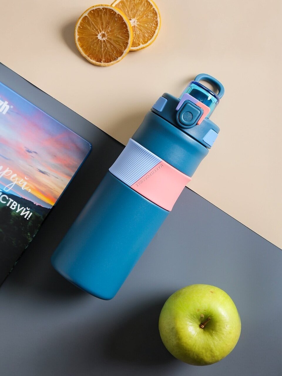 - Оптимальный объём 0.5 л и узкая горловина — удобно брать с собой, легко помещается в сумку или рюкзак.