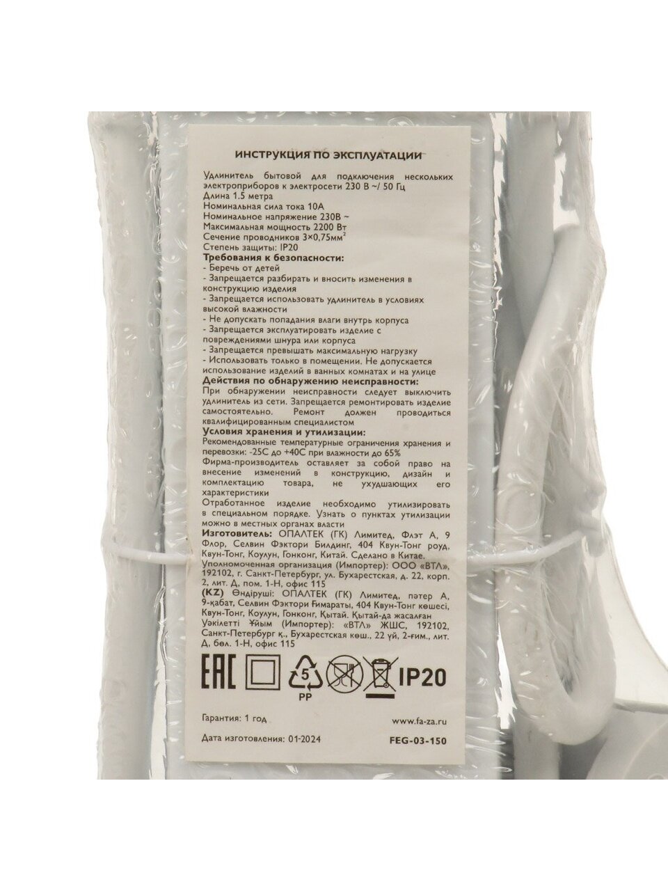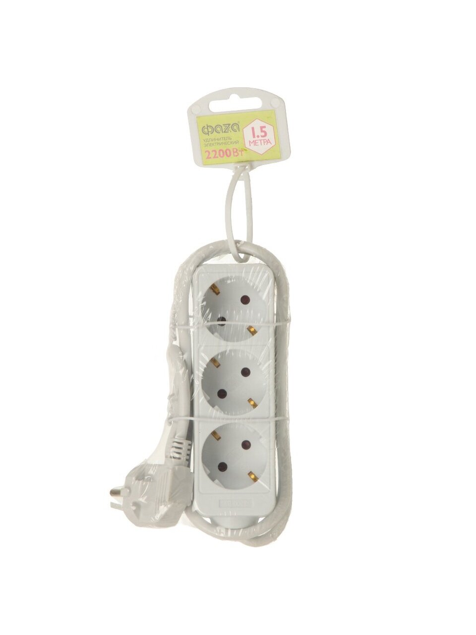 Удлинитель бытовой 3 гнезда, 1.5 м, ПВС, 3х0.75 мм², с заземлением, 10 А, пластик, белый, ФАZА, FEG-03-150, 5052833