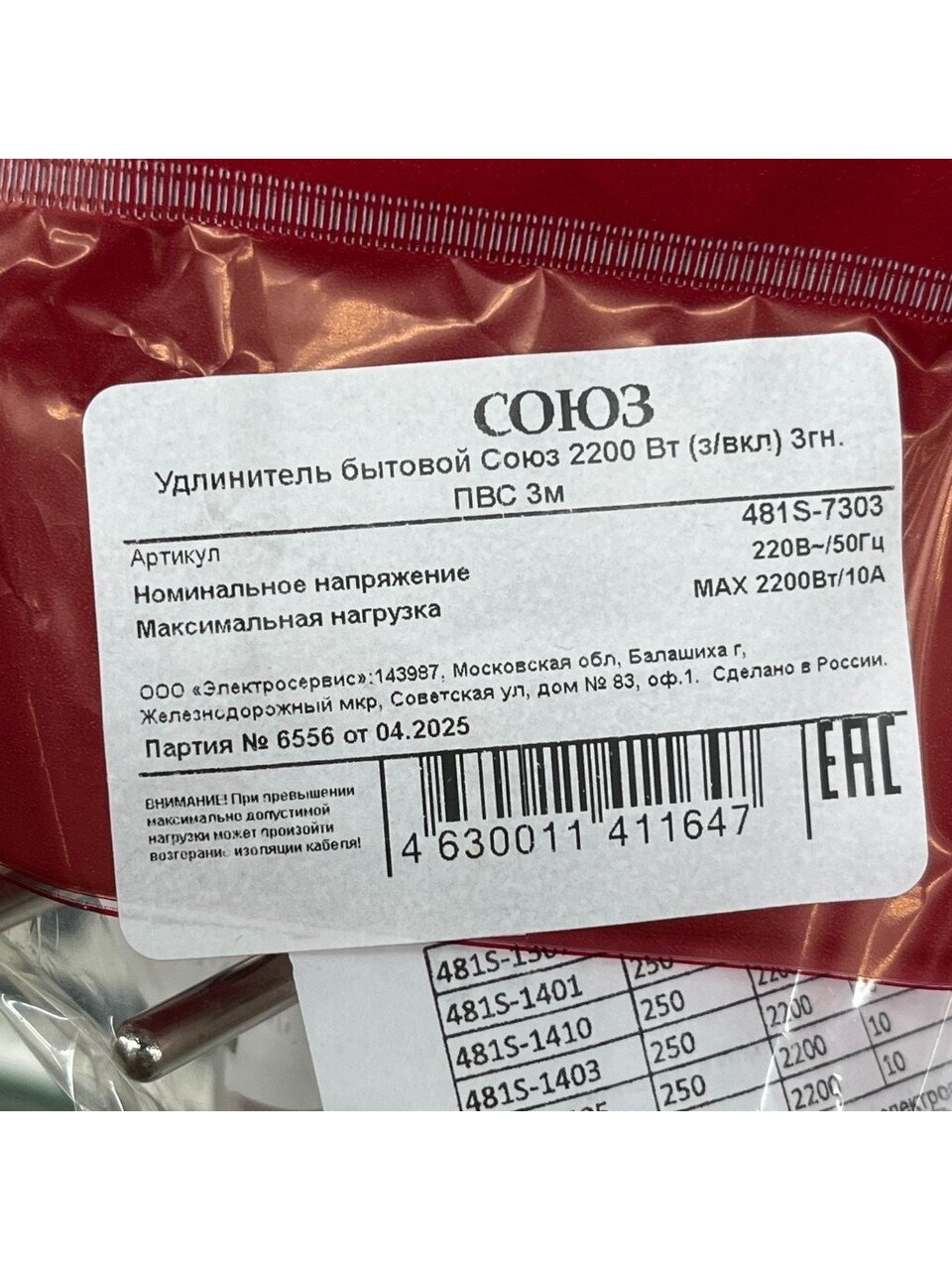 Вы можете приобрести «Удлинитель бытовой 3 гнезда, 3 м, ПВС, с заземлением, выключатель, 2200 Вт, Союз, 481S-7303» и другие товары в нашем интернет-магазине в Краснодаре по низким ценам и с бесплатным самовывозом.