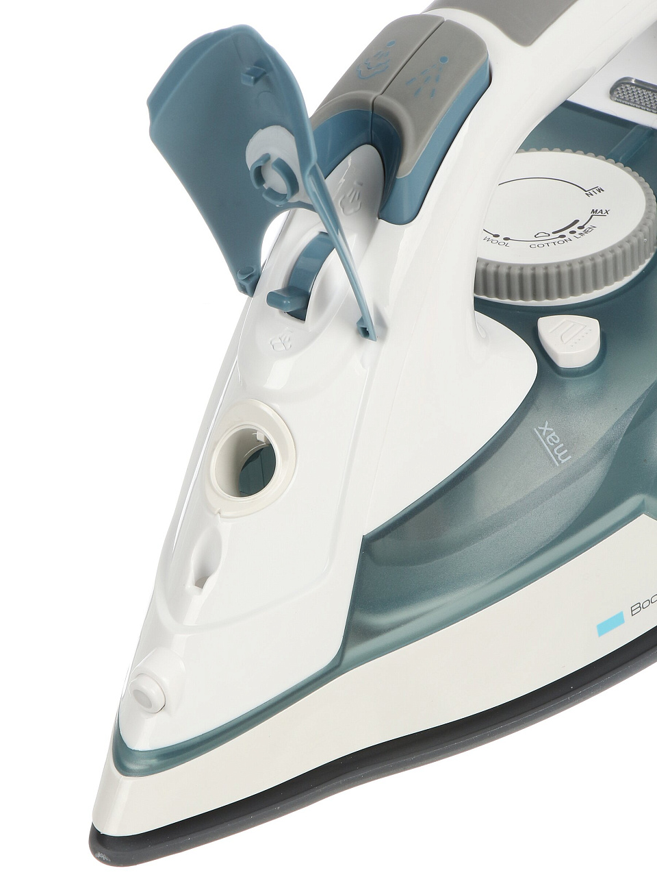 Мощность 2200 Вт, объем резервуара 240 мл, длина шнура 1,6 м, керамическая подошва, паровой удар 140 г/мин, цвет голубой, гарантия 12 месяцев.