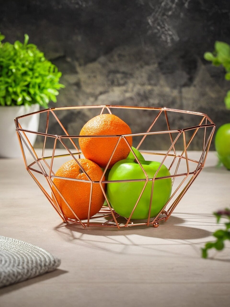 Стильная металлическая корзина для фруктов впишется в любой интерьер Вашего дома и всегда будет радовать Вас и Ваших гостей. Корзина имеет оригинальный геометрический дизайн.