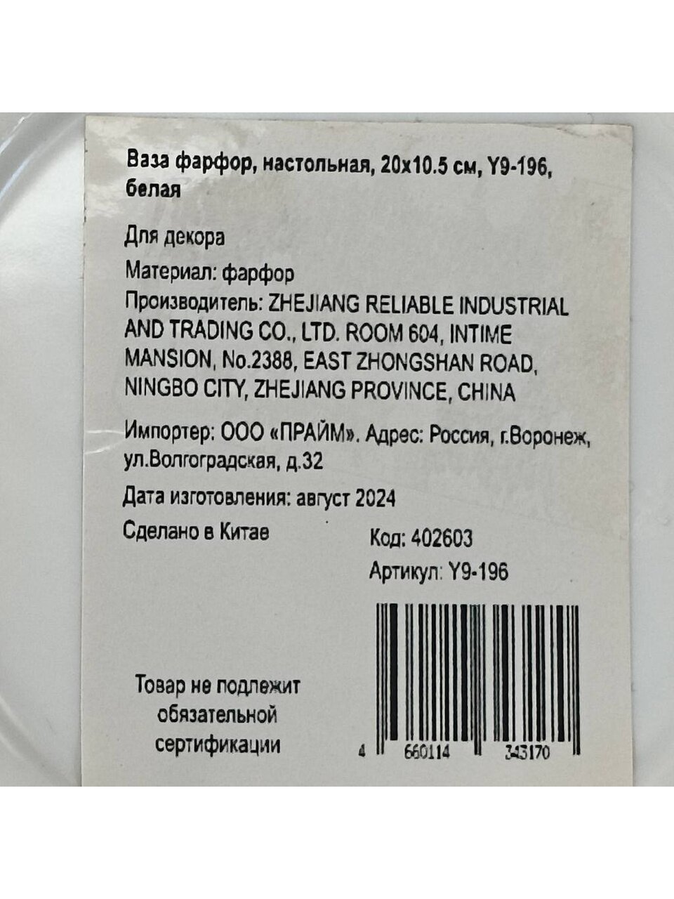 Вы можете приобрести «Ваза фарфор, настольная, 20х10.5 см, Y9-196, белая» и другие товары в нашем интернет-магазине в Астрахани по низким ценам и с бесплатным самовывозом.