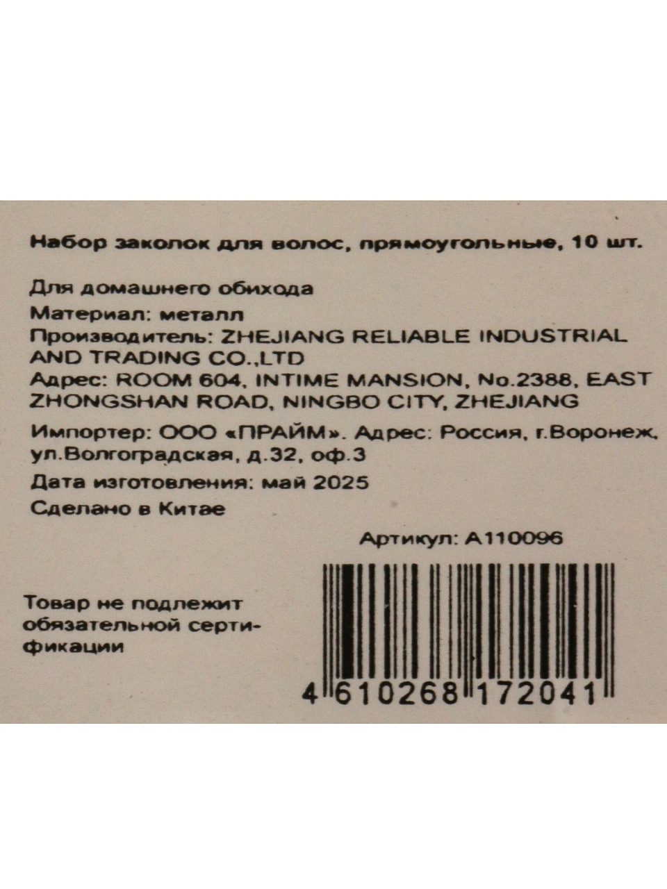 Набор заколок для волос, прямоугольные, 10 шт, A110096