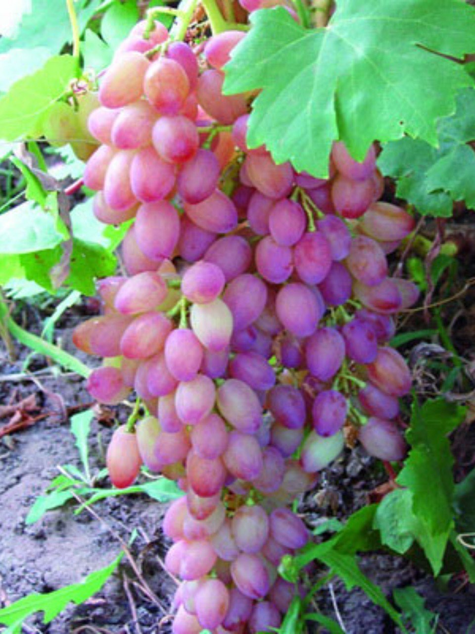 Вид — виноград плодовый; цвет ягод — розовый; тип посадочного материала — саженцы; оптимальное время посадки — весна или осень; подходит для выращивания на солнце.